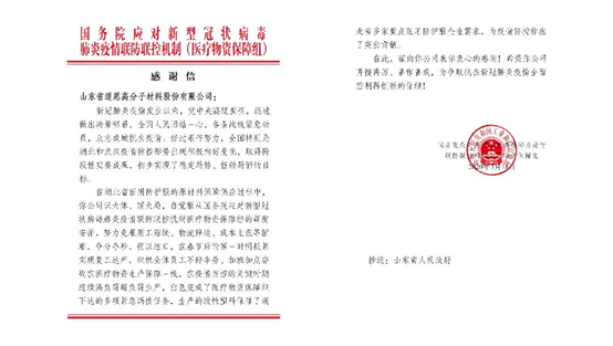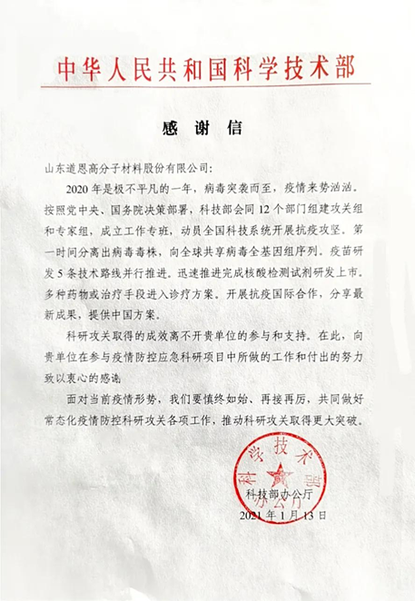 At the beginning of 2021, Dawn polymer received a thanks letter from the Ministry of Science and Technology. This is another national level thanks letter since Dawn Polymer received the thanks letter from the State Council last year.