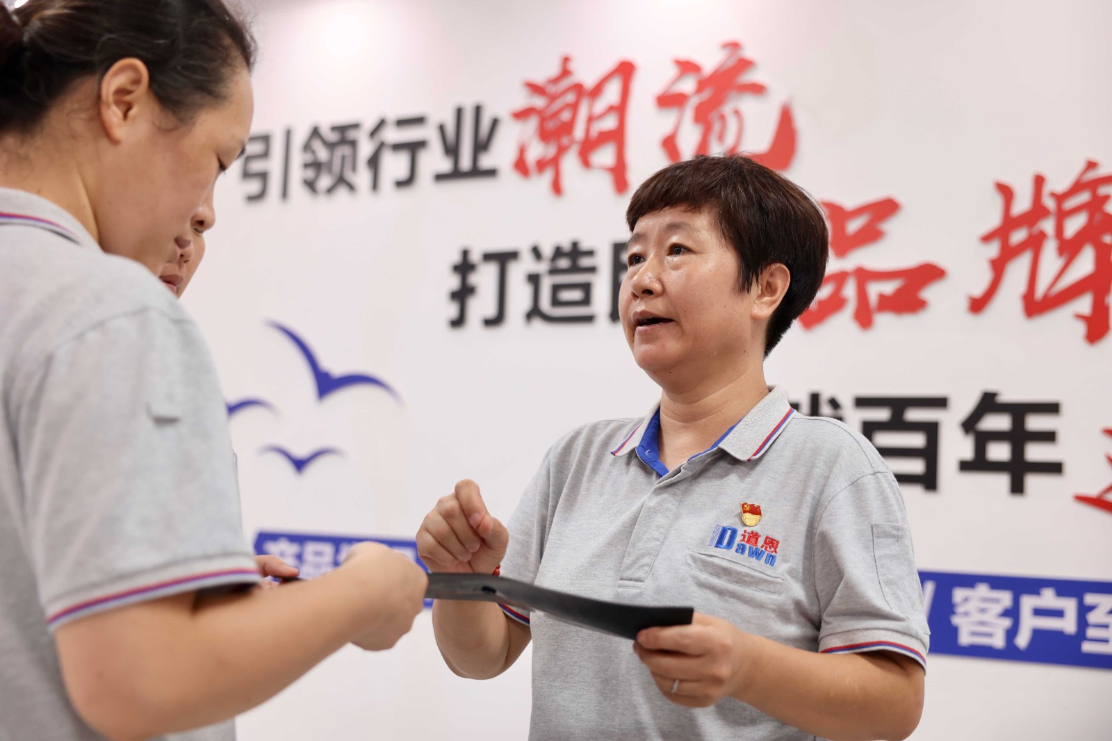 王红与同事交流工作