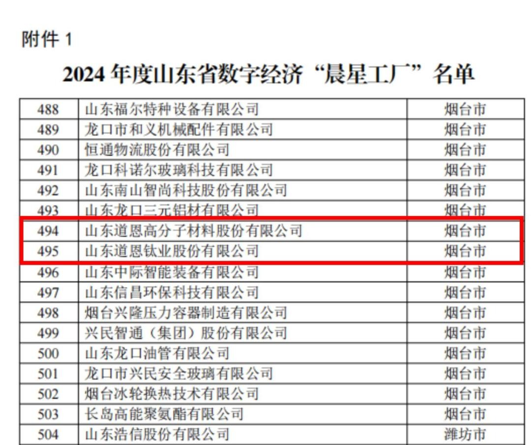 近日,山东省工信厅公布2024年度山东省数字经济“晨星工厂”名单,JN体育股份、JN体育钛业公司双双名列其中。