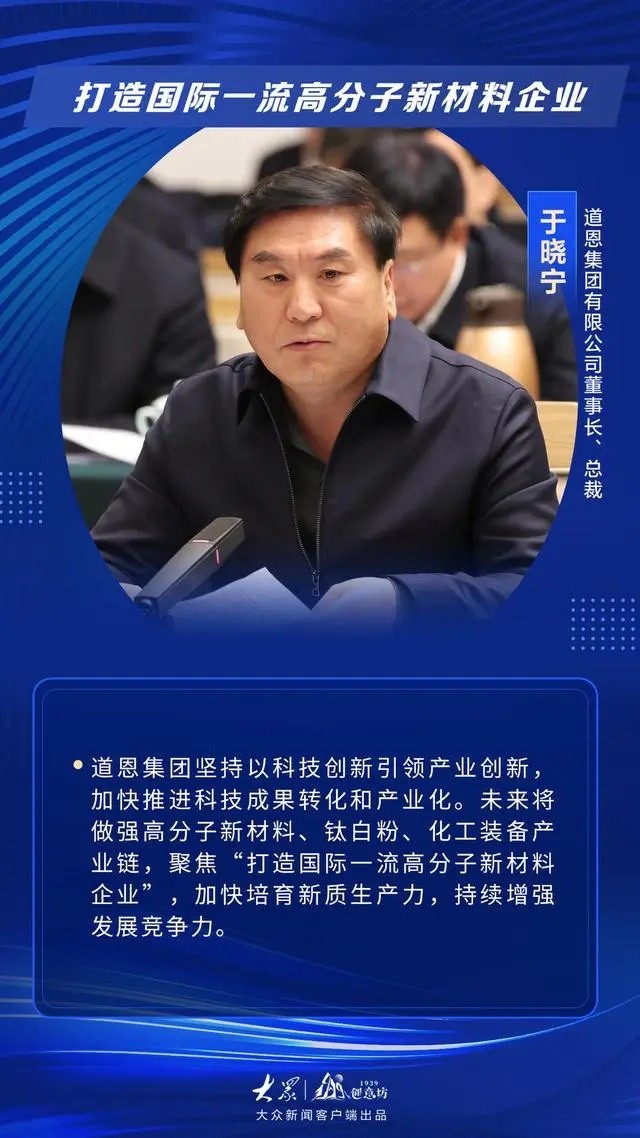 “参加了很多次民营企业座谈会,每次都有感有得。政府对民营经济的支持力度不断增大,提振了企业发展信心。”于晓宁董事长表示,自己现在干劲十足,将带领企业全力以赴挖潜扩能、做强实业,聚焦打造国际一流高分子新材料企业,加快培育新质生产力,持续增强发展竞争力,力争到2030年跻身中国民营企业100强。