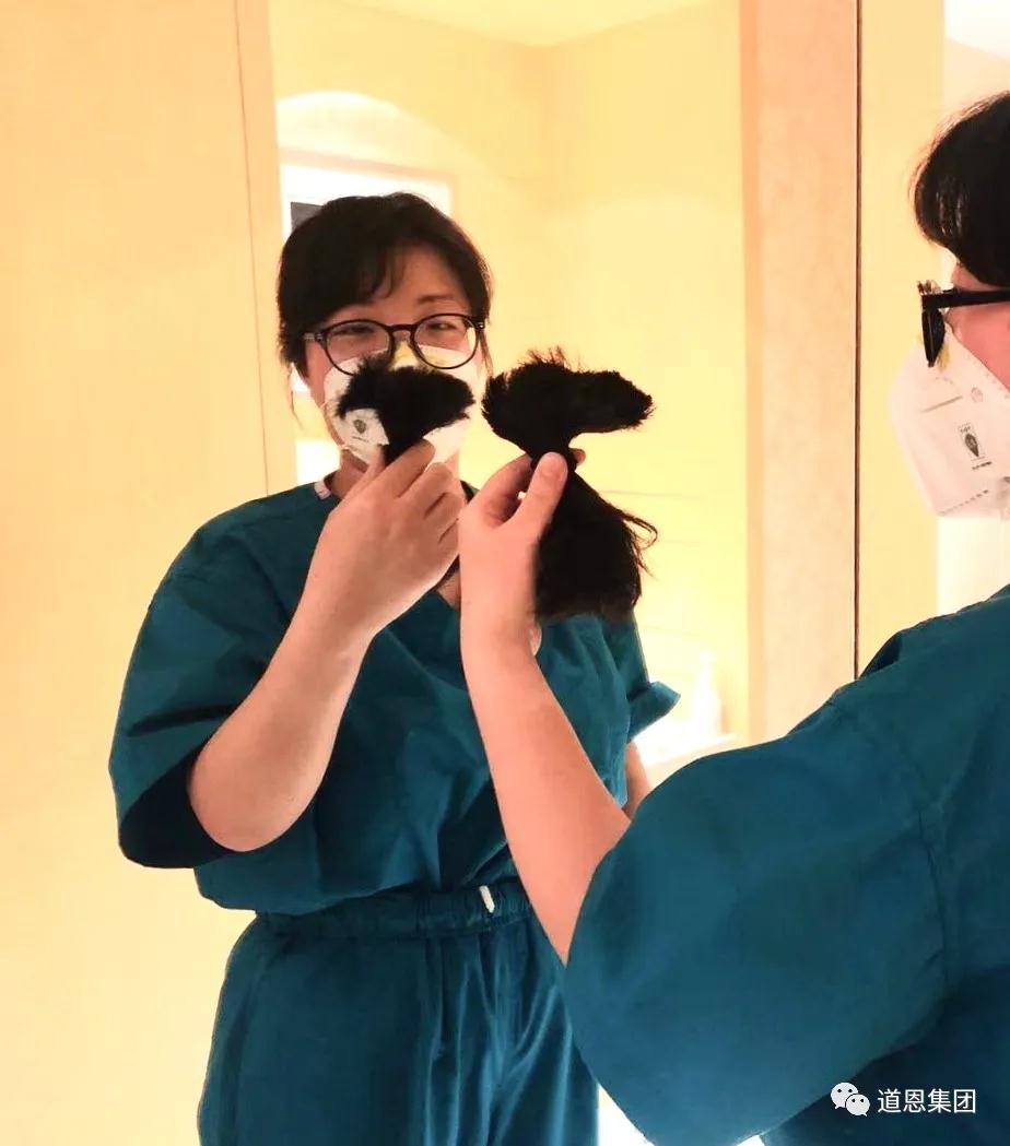抵达武汉后,郑俊博被分配到同济医院中法院区病房工作。这里的患者都是危重症患者,病情变化快、感染风险高,为了杜绝感染风险,她剪掉了一头长发,没有一丝怨言。“我要加油,大宝还等着我打败病毒回家,带他们出去玩呢”。郑俊博朴素的话语中,蕴藏着无限的勇气。