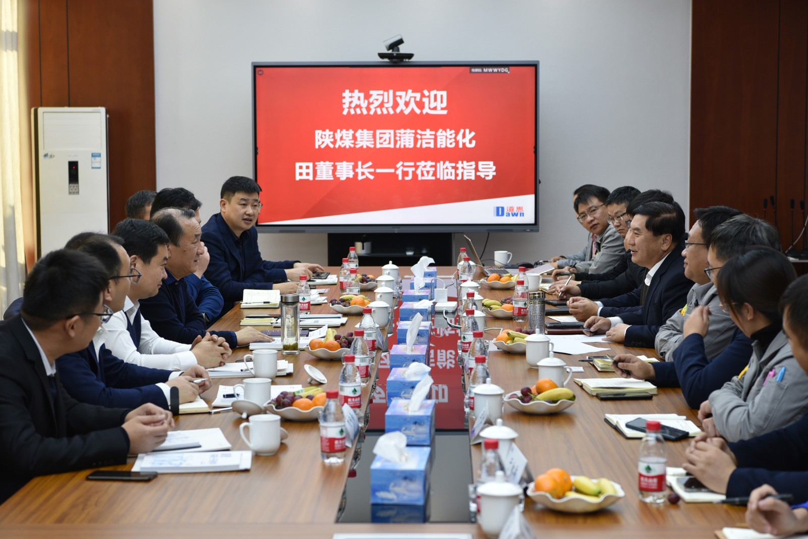 11月24日,蒲城清洁能源化工有限责任公司(简称“蒲洁能化”)党委书记、董事长田玉民一行8人来JN体育集团访问考察,旨在增进友谊、扩大合作、共谋发展。JN体育集团董事长、总裁于晓宁陪同考察与座谈。