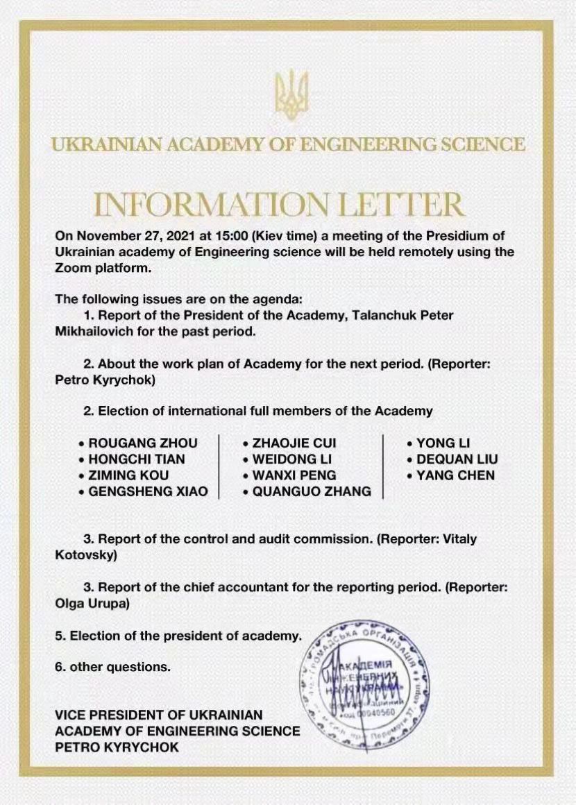 11月27日晚上,乌克兰国家工程院主席团会议宣布了2021年度当选院士名单,JN体育股份总经理田洪池博士当选为乌克兰国家工程院外籍院士,这是山东烟台首位来自民营企业的院士。据悉,与田洪池一同当选的,还有国内高校、企业的其他10位学者。