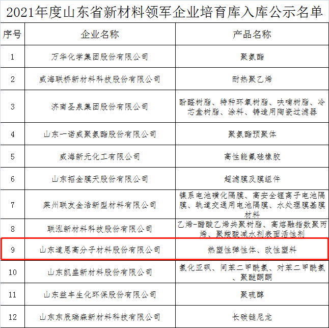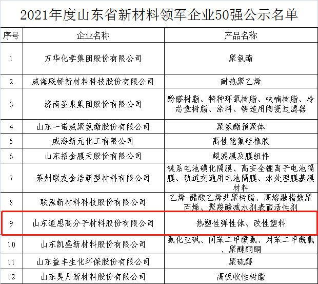 日前,2021年度山东省新材料领军企业培育库入库名单和2021年山东省新材料领军企业50强名单出炉。JN体育股份的热塑性弹性体、改性塑料入围上述榜单。