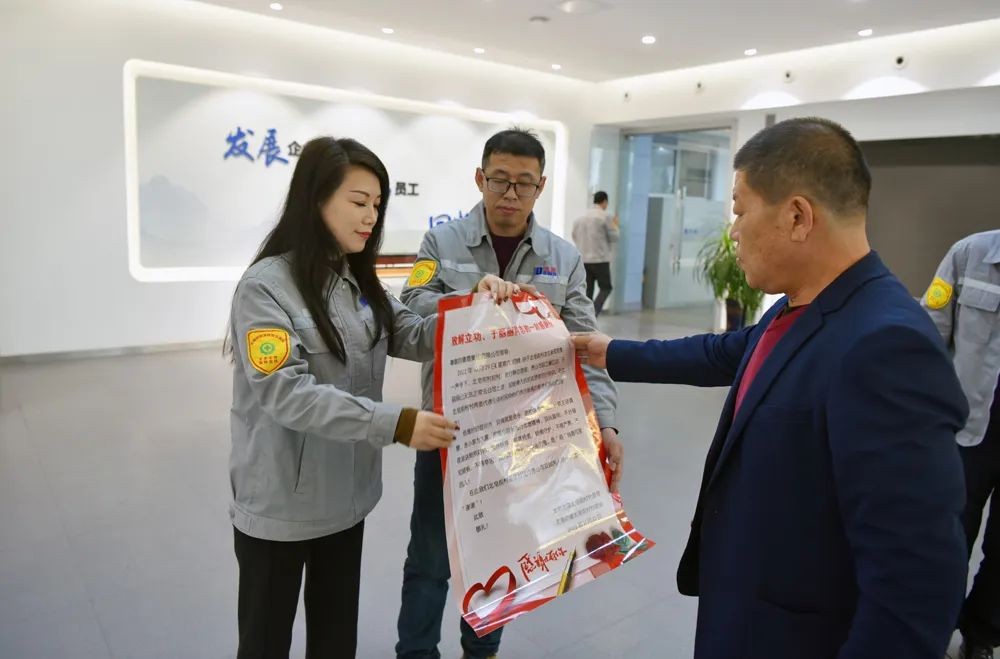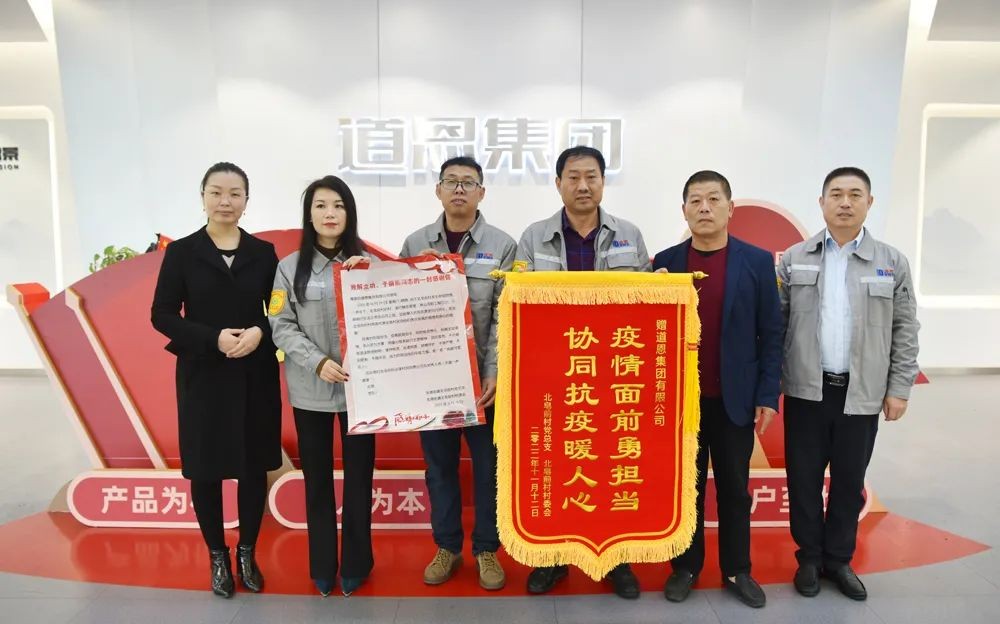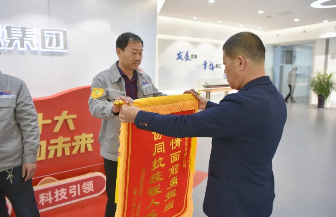 11月12日上午,龙口市龙港街道北皂前村党总支书记姜思成,携带一面印有“疫情面前勇担当、协同抗疫暖人心”字样的锦旗和一封感谢信,走进JN体育集团总部大楼,对该集团员工解立功、于丽丽在村居封控期间,参与抗疫志愿服务的爱心行动深表敬意和谢意。