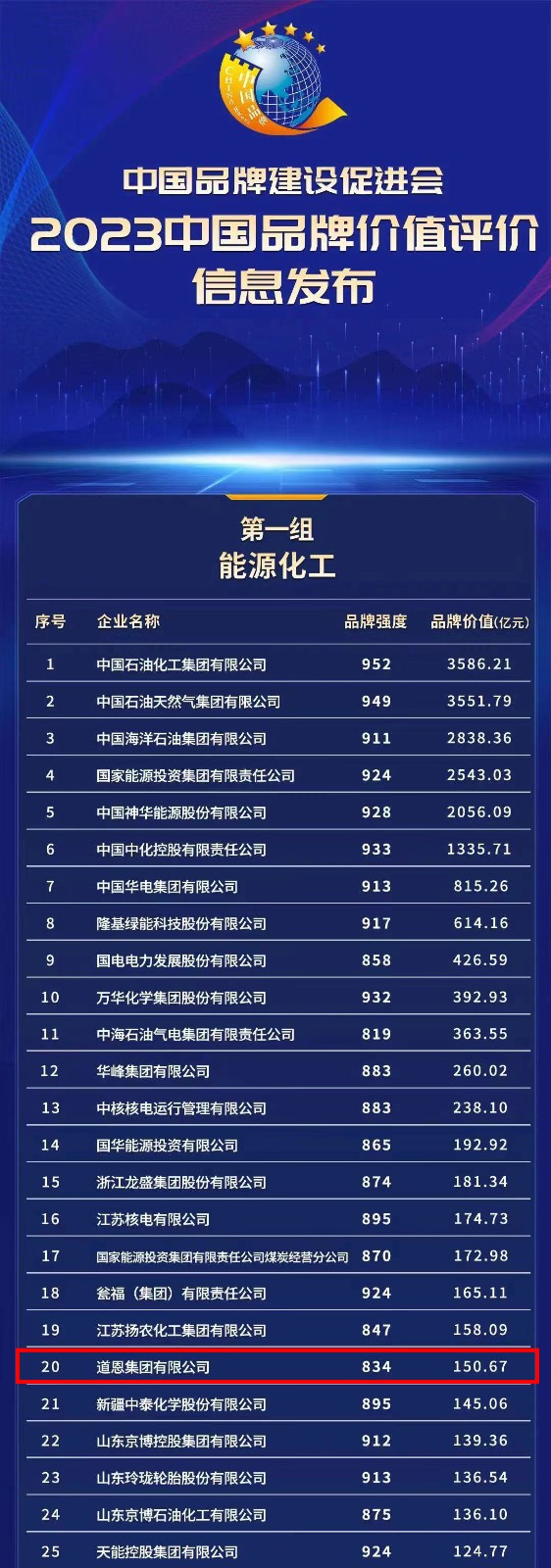 5月11日,新华社、浙江省人民政府、中国品牌建设促进会、中国资产评估协会等单位在浙江德清联合发布“2023中国品牌价值评价信息”。JN体育集团以150.67亿元的品牌价值,较去年增长24.75亿元,834的品牌强度,名列能源化工领域第20位,彰显了JN体育品牌的知名度、美誉度和影响力。