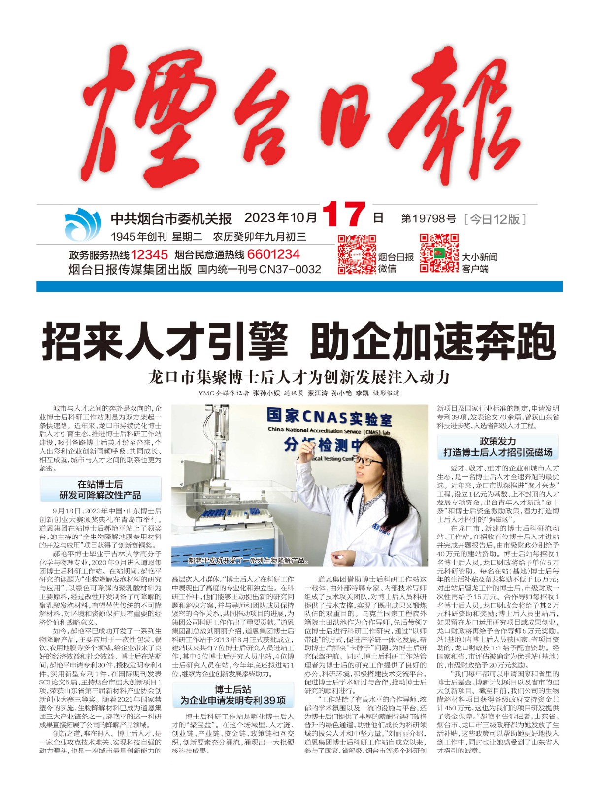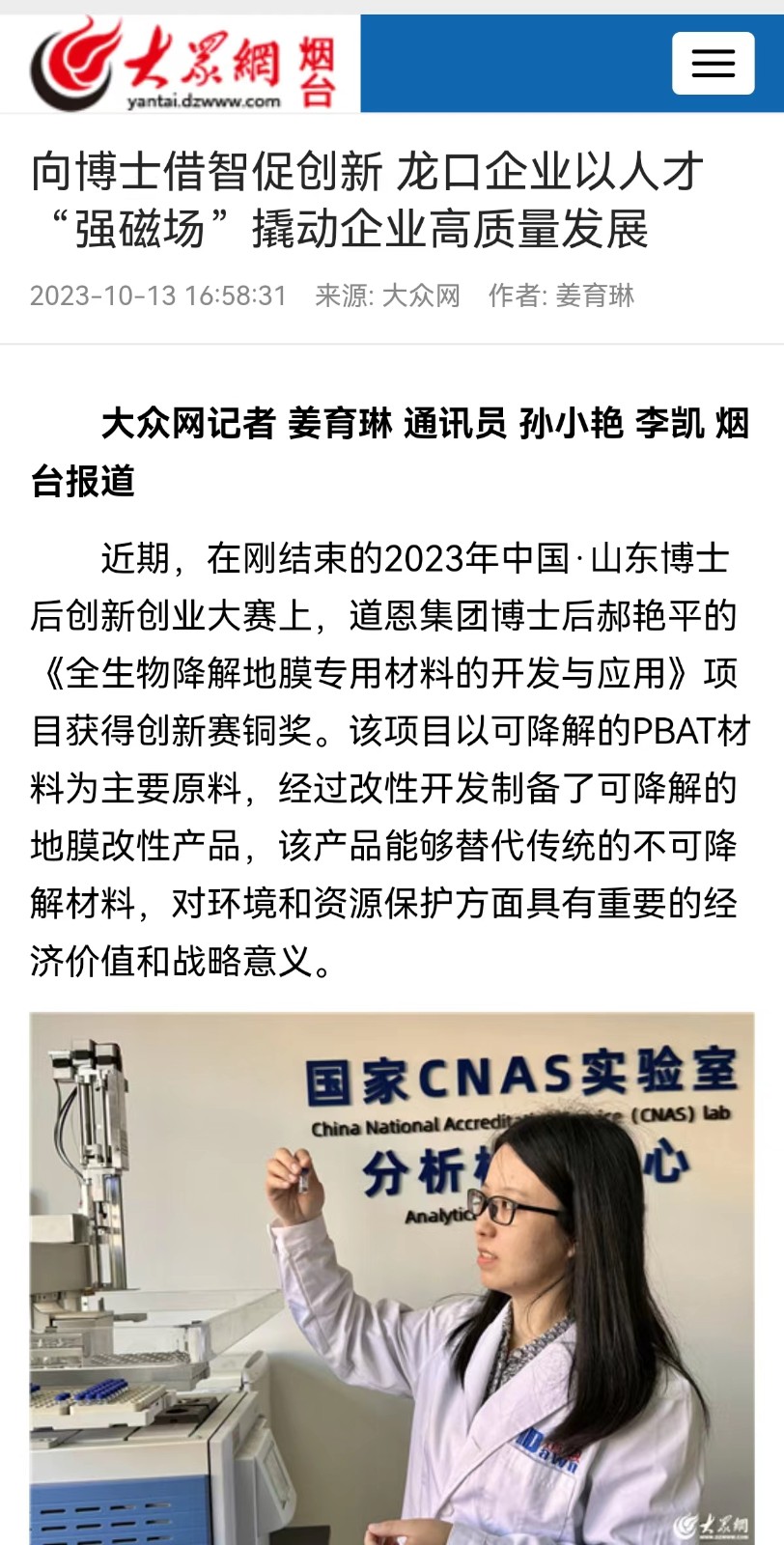 此前的9月18日,2023年中国·山东博士后创新创业大赛颁奖典礼在山东省青岛市举行。JN体育集团在站博士后郝艳平站上了领奖台,她主持的“全生物降解地膜专用材料的开发与应用”项目获得了创新赛铜奖。据悉,这是龙口市唯一获奖的博士后工作站项目。